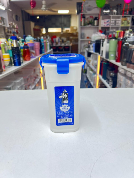 A practical and roomy 630ml plastic storage cup designed with a secure snap-lock blue lid to keep beverages, snacks, and powders tightly sealed and fresh throughout the day.