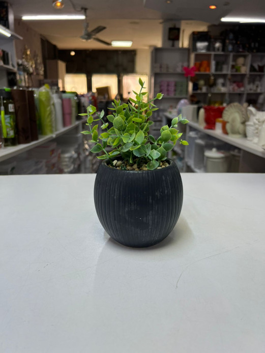 The item is an artificial eucalyptus plant arranged in a ribbed black bowl-style planter, designed to bring a soft, natural look with a bold modern base. It’s a stylish, low-maintenance décor piece perfect for contemporary interiors.