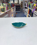 Ceramic, leaf-shaped trinket or serving dish with a gold rim.