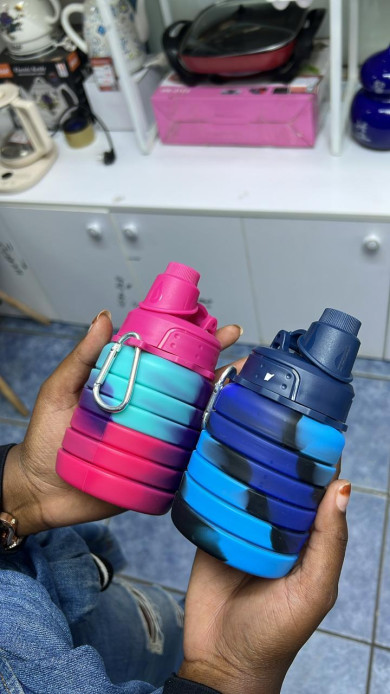 Stay hydrated on the go with this collapsible silicone water bottle in a colorful rainbow design. It folds down to a compact size for easy storage in bags or pockets, making it perfect for travel, gym, hiking, school, or everyday use. The bottle is made from safe, food-grade silicone and features a secure lid with a carabiner clip for easy carrying.