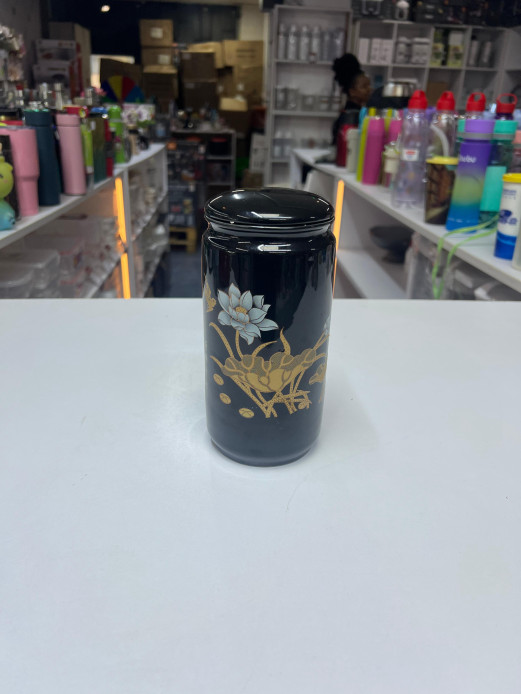 🎎 Vintage Japanese Black Porcelain Canister – Gold & White Floral Design 🎎