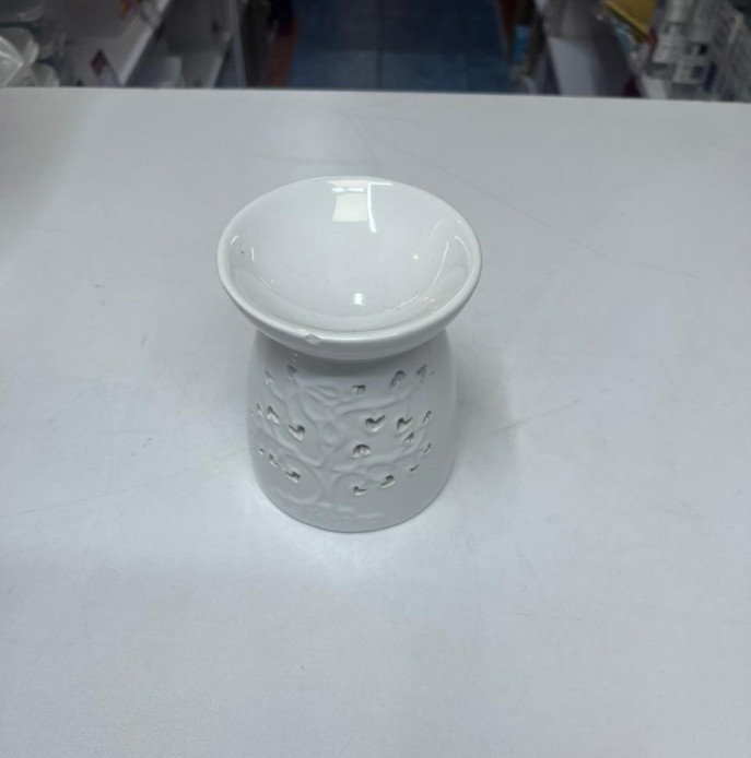 A sleek and minimalist white ceramic burner designed to gently diffuse essential oils or melt wax tarts, filling your space with soothing aromas. Perfect for creating a relaxing and inviting atmosphere in any room.