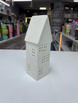 A charming house-shaped tealight holder crafted from smooth ceramic or porcelain, designed to create a warm and cozy glow in any space.