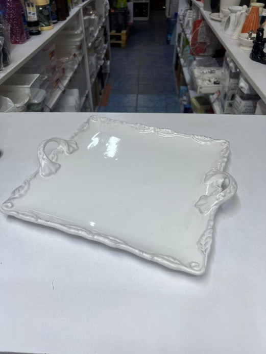 The White Decorative Ceramic Serving Tray combines elegance with functionality. Made from durable ceramic with a smooth glossy finish, it features ornate handles and a delicate border design. Perfect for serving snacks, desserts, or drinks, it also doubles as a decorative accent in any home.