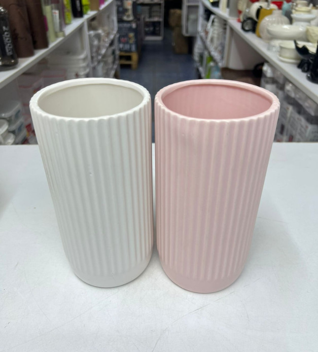 White/ Pink ribbed ceramic flower vase is similar to Nordic-style design