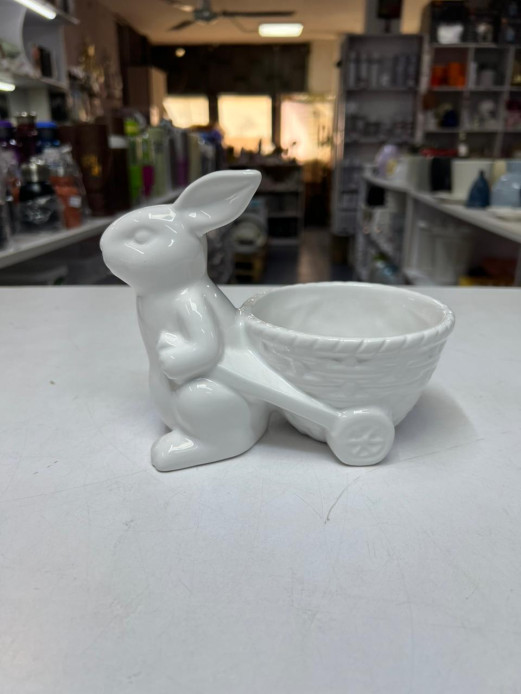🐰 White Glazed Ceramic Bunny with Cart – Whimsical Dec...